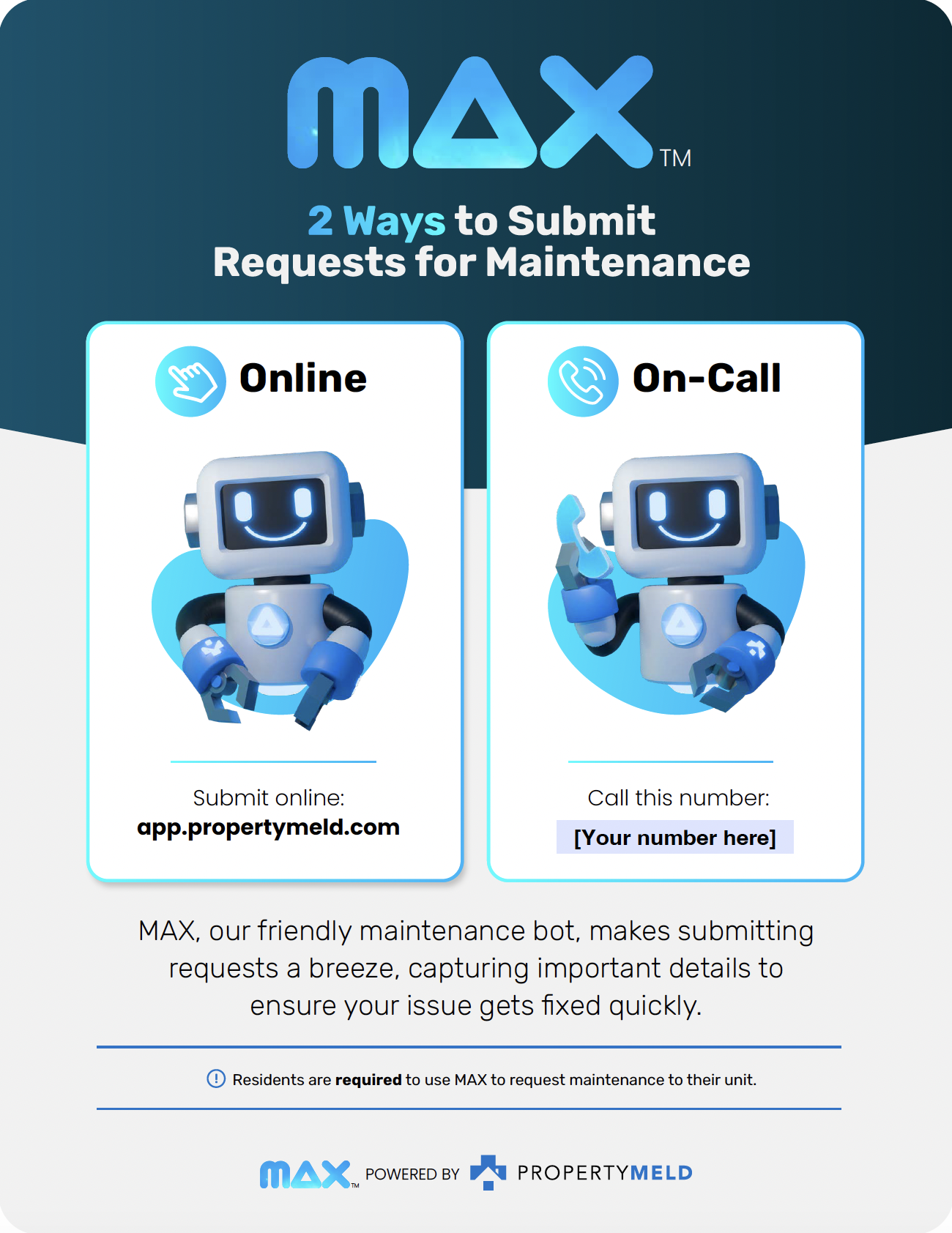 Let your social media followers know that you now use the best (and friendliest) AI bot for submitting maintenance requests! Use the space on the bottom right for your logo. Here’s how to add your logo easily, using Canva.